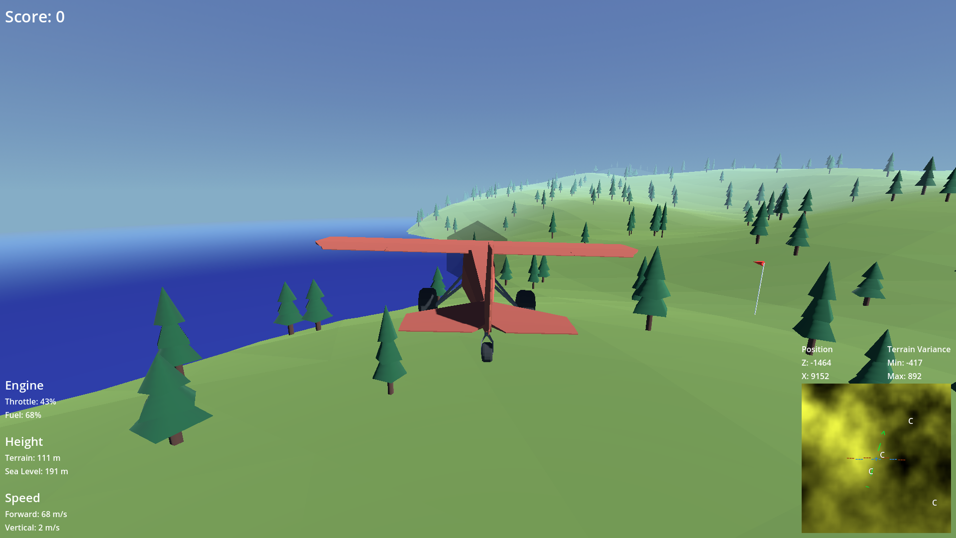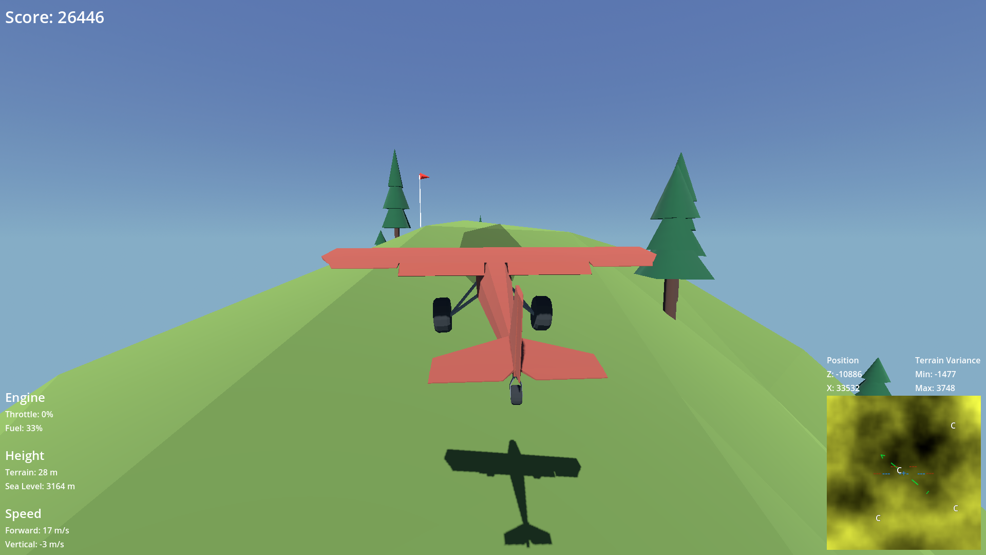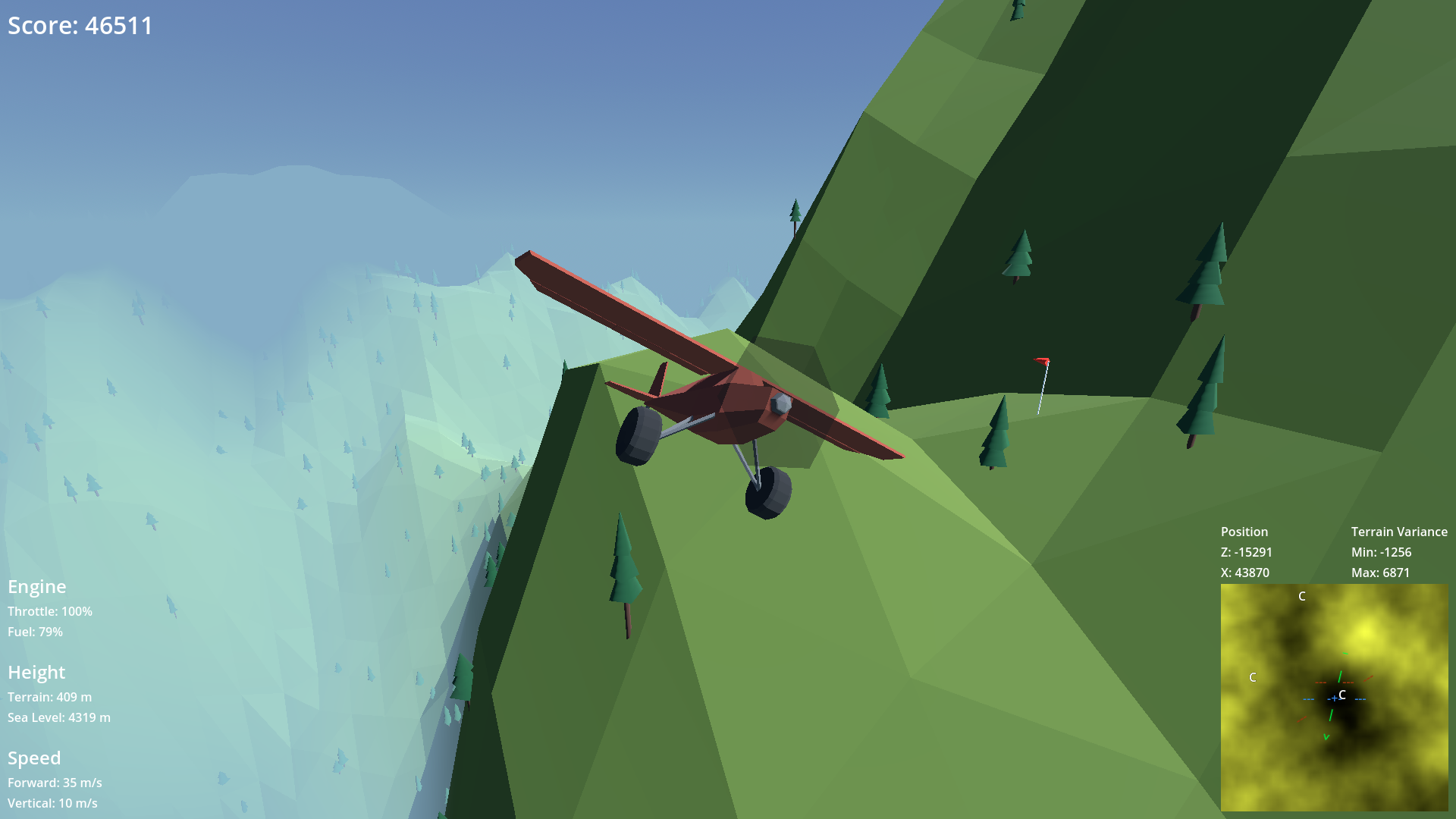 Embark on an adventure with a small bush plane. Your goal is to land on a checkpoint as far from the start point as possible, and then come back. As you get further away, the terrain becomes harder to navigate, until eventually, it's impossible. It's up to you to decide when to go back.