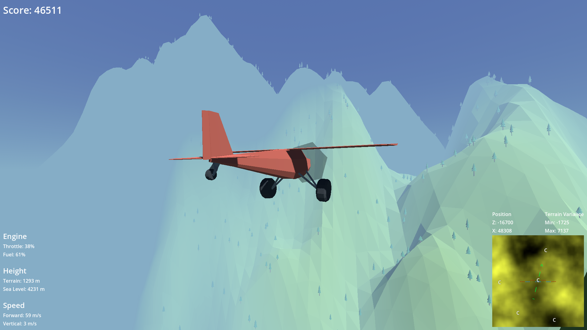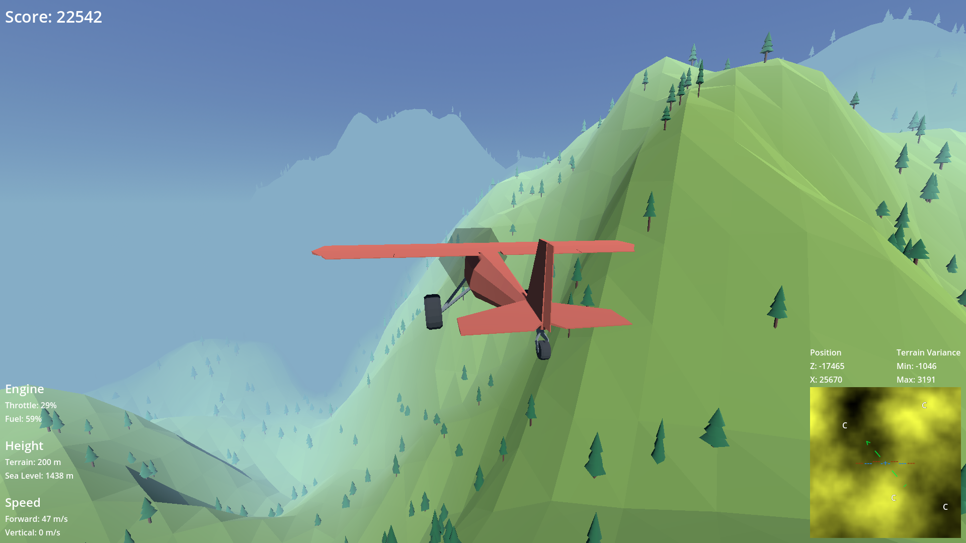 The main technical goal of this project was to put together flight mechanics and procedural terrain in a prototype Godot package. The git repository is available here: https://gitlab.com/mitk0100/bush-522
